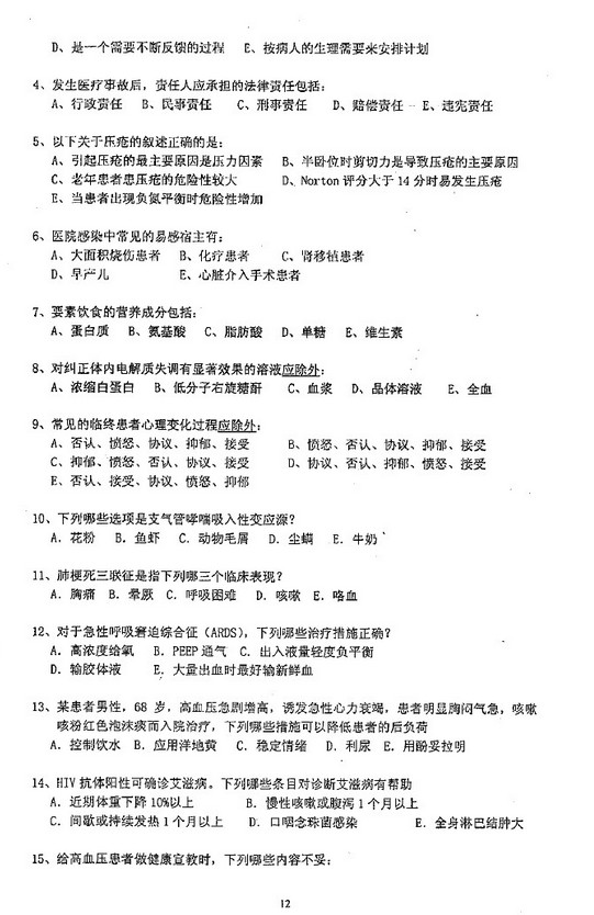 1.护士晋升制度,哪一年颁布的法律 2.莱宁格跨文化护理理论四层中第二层的内容 3.符合交叉感染的是(有四个选项,具体不记得了) 4.艾瑞克森每个期对应的问题(考了其中一个时期) 5.关于肠结核正确的说法(单选,具体选项忘了,考的挺细) 6.吸收最快的给要途径 7.溃疡性结肠炎活动期不能做的检查 8.马斯洛需要层次 ...