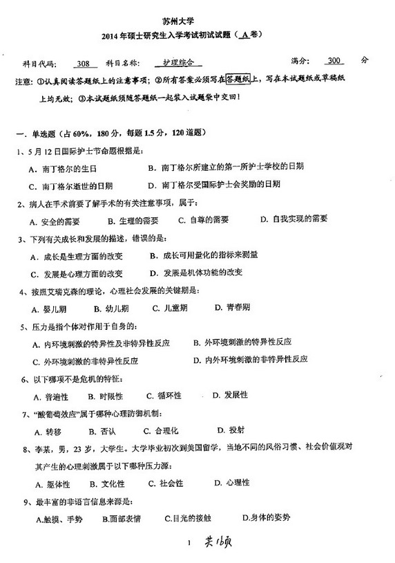 2014年苏州大学308护理综合考研试题