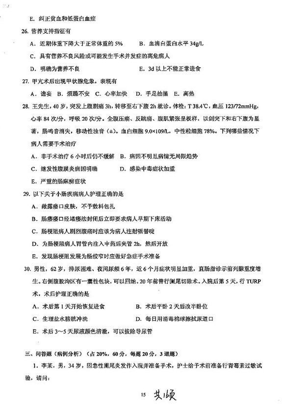 单选多选病理分析 单选比较简单,考察的都比较灵活 多选不难,就是四个答案错一个也不给分,要求对知识点把握的很准确 病理分析,三道题,护理基础比较偏,考了导尿,外科考的消化性溃疡穿孔 内科考的心梗 ...