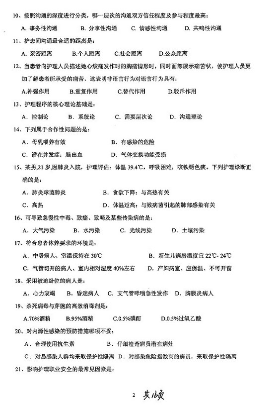 1.护士晋升制度,哪一年颁布的法律 2.莱宁格跨文化护理理论四层中第二层的内容 3.符合交叉感染的是(有四个选项,具体不记得了) 4.艾瑞克森每个期对应的问题(考了其中一个时期) 5.关于肠结核正确的说法(单选,具体选项忘了,考的挺细) 6.吸收最快的给要途径 7.溃疡性结肠炎活动期不能做的检查 8.马斯洛需要层次 ...