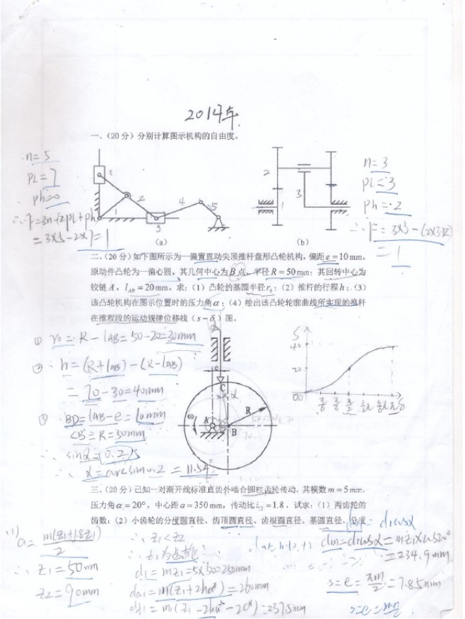2014 武汉理工 892机械设计基础考研真题回忆版 题型:选择、填空、简答、自由度计算、作图、大题 选择、填空考的知识点很细,覆盖面很广,平时看书要多注意细节! 1、简答(有的想不起来,把记着的给大家说一下吧): 1、轴承型号解释(每年必考) 2、当量齿轮含义,推导当量齿轮齿数与角的关系公式 3、影 ...