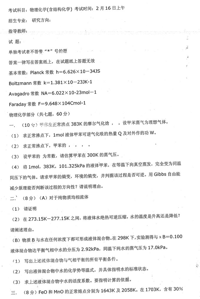 北京大学历年物理化学含结构化学考研真题
