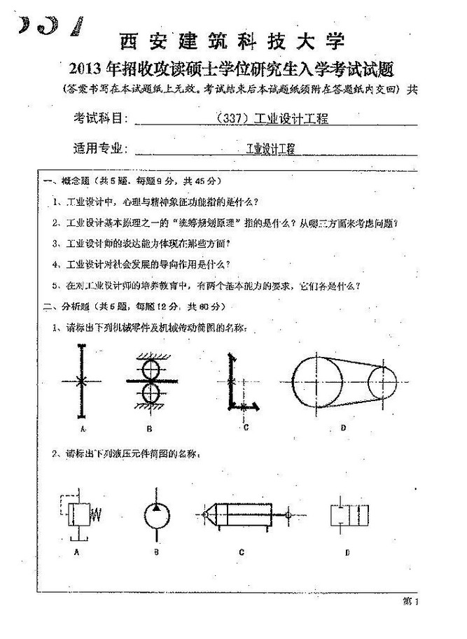 2013-2014年西安建筑科技大学337工业设计工程考研初试真题