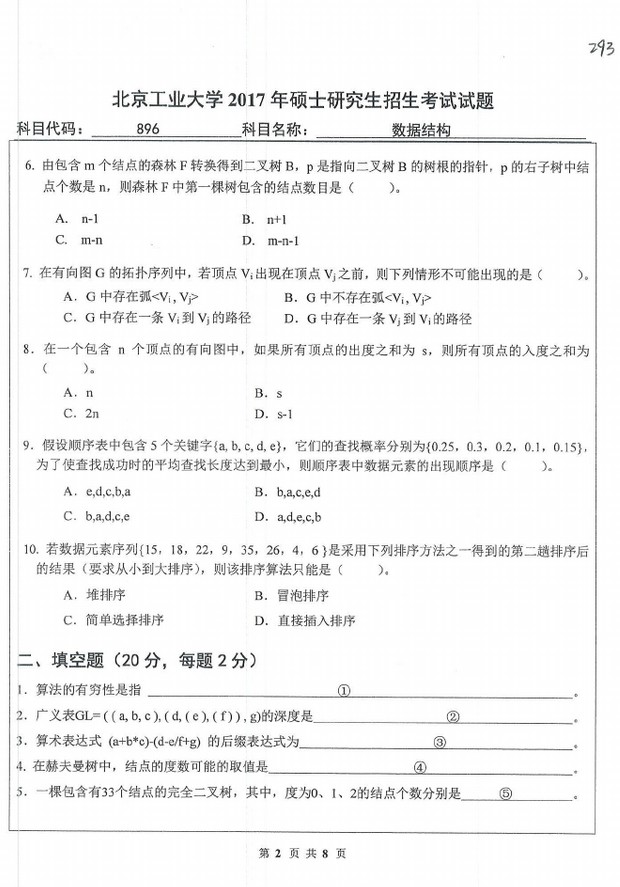 北京工业大学2017年硕士考试试题896数据结构真题(2)