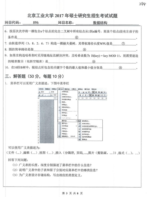 北京工业大学2017年硕士考试试题896数据结构真题(3)