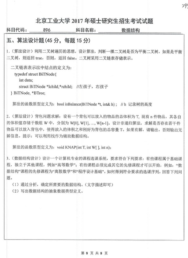 北京工业大学2017年硕士考试试题896数据结构真题(8)