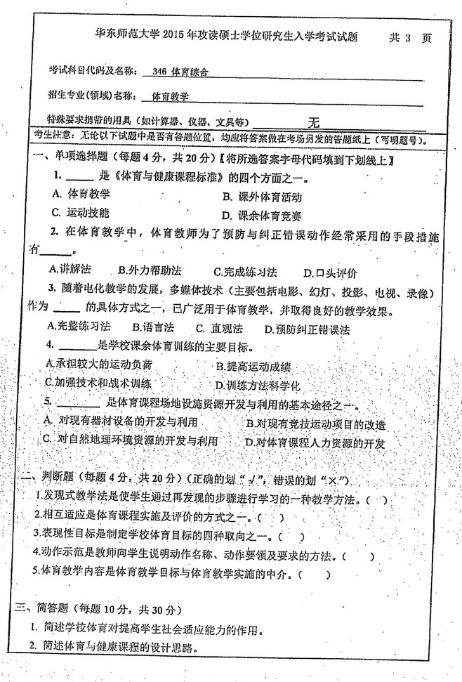 (2)初试沿用已久学校体育学改为体育概论,所以目前初试的三科为运动训练学,运动生理学及体育概论