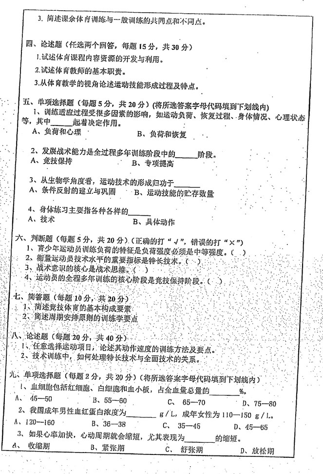 2001年成都体育学院攻读硕士学位研究生入学试题《运动训练学》 一、名词解释。(5*4) 1、运动技术 2、学校体育 3、运动训练 4、体育教学过程 二、填空题(每题2分共20分) 1、体能主导类项目可分为()()和()三个 2、战术训练方法可分为分解与完整训练法、减难与加难训练法、虚拟现实训练 ...
