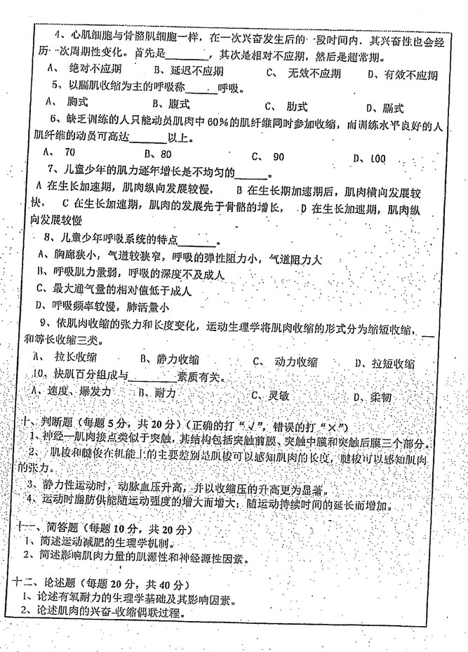 2018年北京体育大学硕士研究生招生入学考试 运动生理学及运动解剖学 注意:考生需将试题答案写在答题纸上,写在试卷上无效! 第一部分运动生理学 简答题 1.肺活量的影响因素 肺活量反映了肺一次通气的最大能力,也是测定肺通气功能简单易行的指标,应用较普及,常用于评定运动员的训练水平和开展国民体质测定。 因素 ...