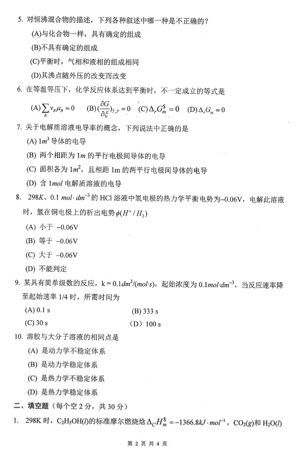 2009年云南师范大学822物理化学考研真题考研试题(2)