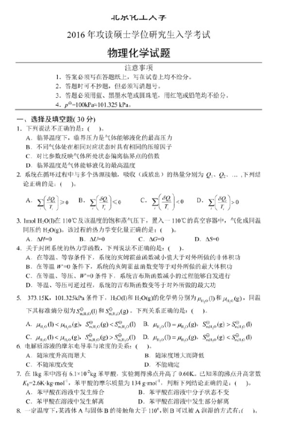 2014-2016年北京化工大学物理化学硕士考研真题(10)