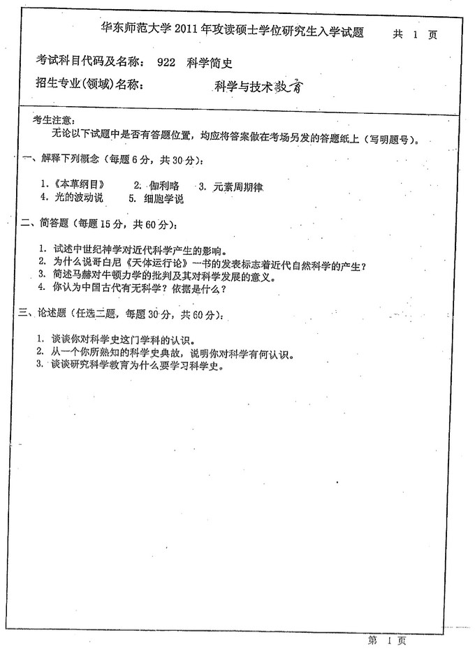 华东师范大学925科学技术发展史2010-2011-2015考研真题(2)