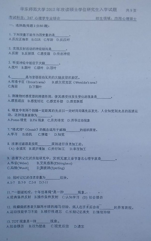 华东师范大学2012年硕士347心理学专业综合考试试题
