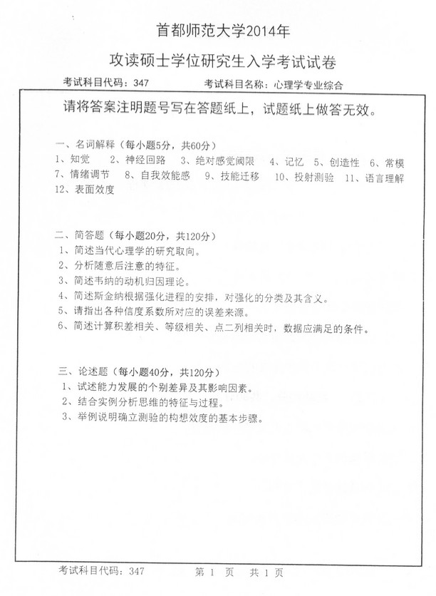 首都师范大学心理学专业综合2011-2015考研真题带部分答案