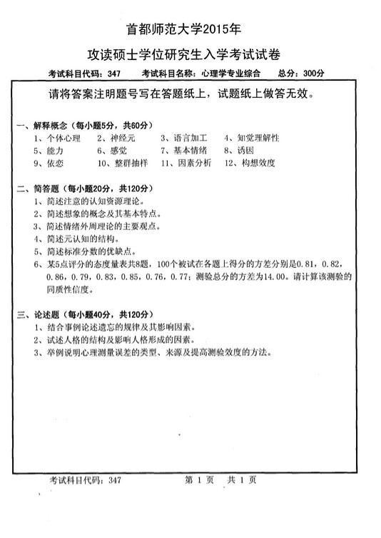 首都师范大学心理学专业综合2011-2015考研真题带部分答案(2)