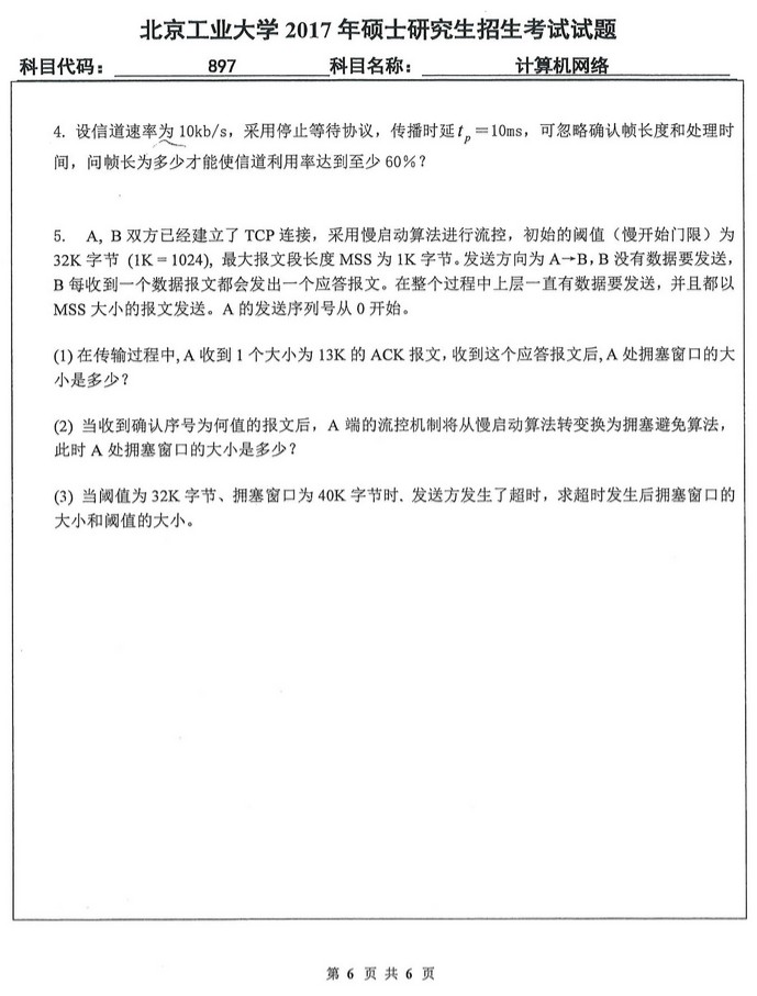 北京工业大学2017年硕士897计算机网络考试试题(6)