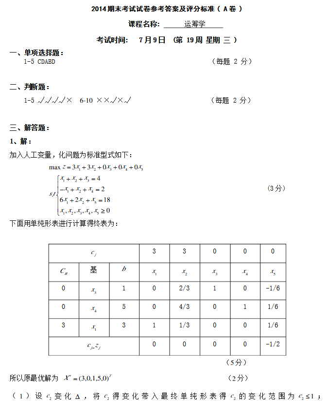 东北大学考研2014运筹学期末考试试卷A(5)