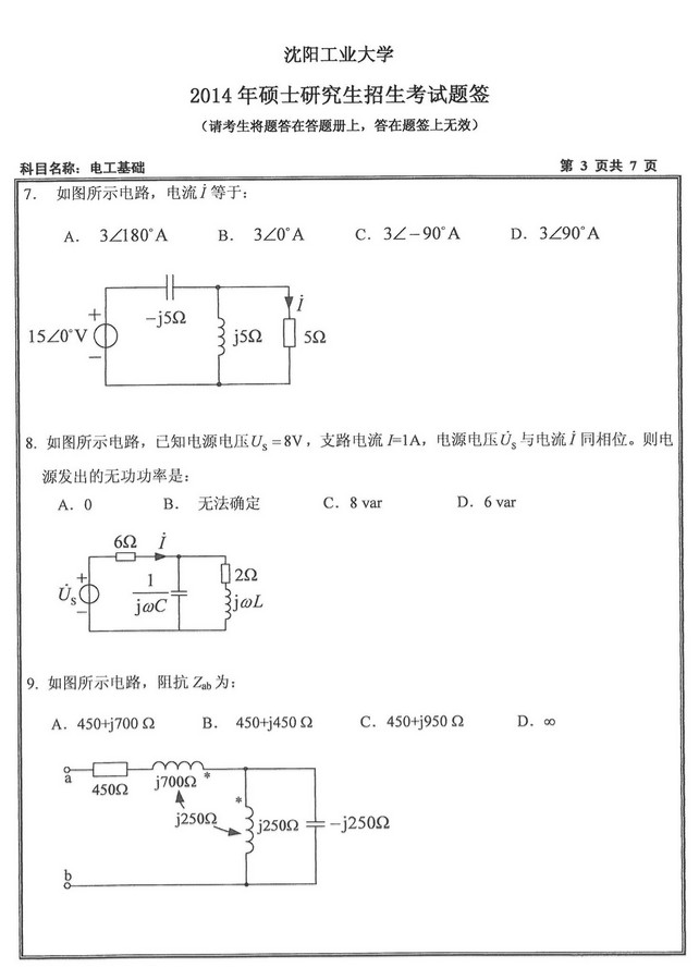 2014年沈阳工业大学804电工基础考研真题(3)