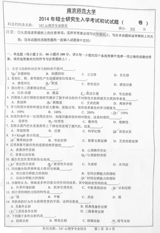 2014南京师范大学347心理学专业综合考研试题