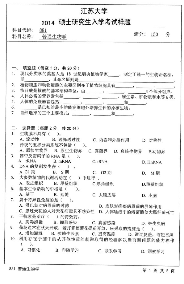 2010-2014江苏大学普通生物学复试历年考研真题(9)