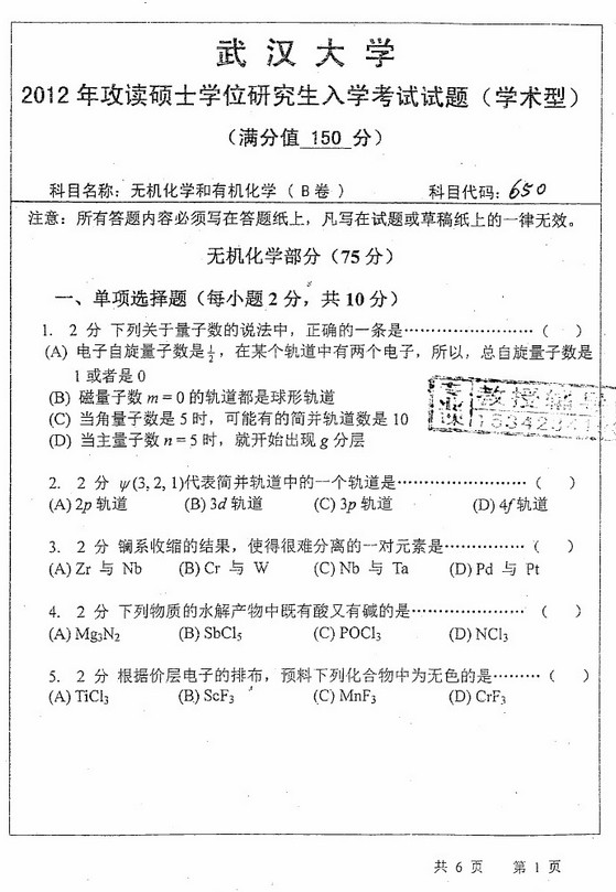 武汉大学2012年无机化学和有机化学B650考研试题