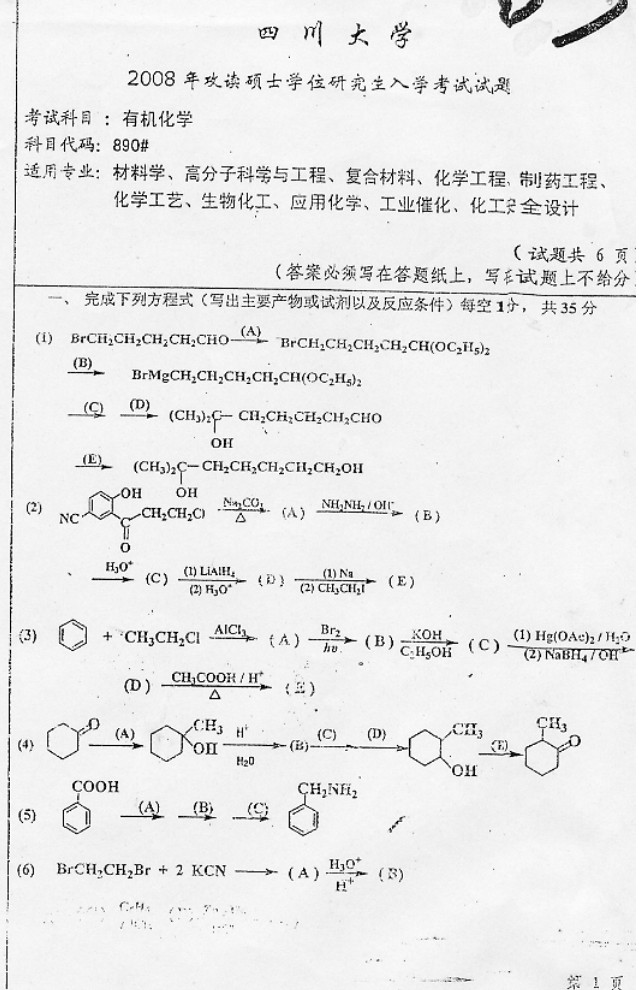 2007-2010年四川大学890有机化学硕士研究生考研考试真题(6)