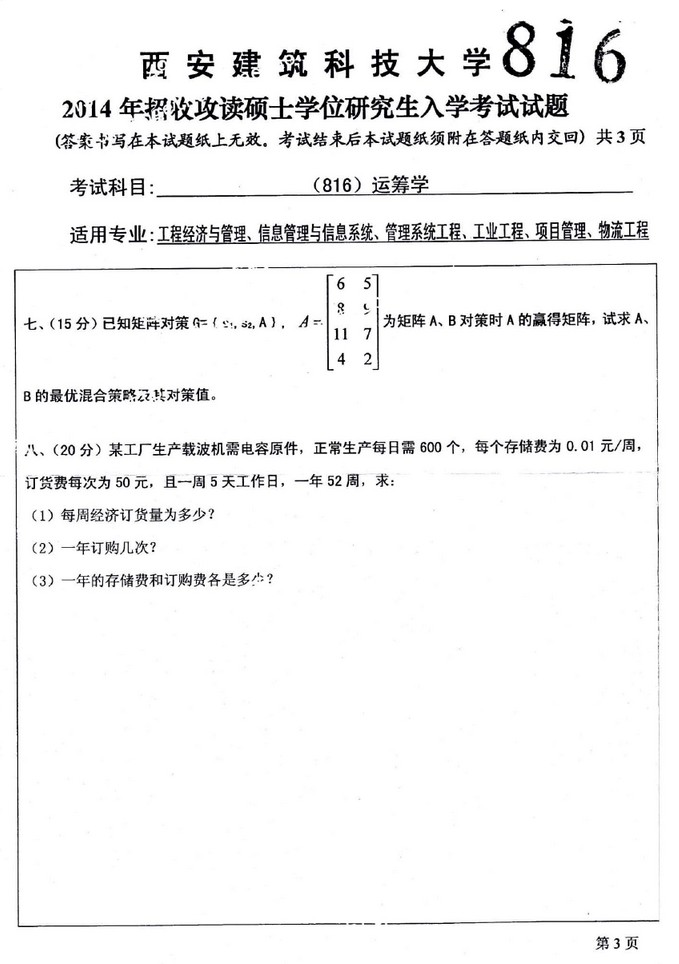 2014年西安建筑科技大学816运筹学考研真题(3)