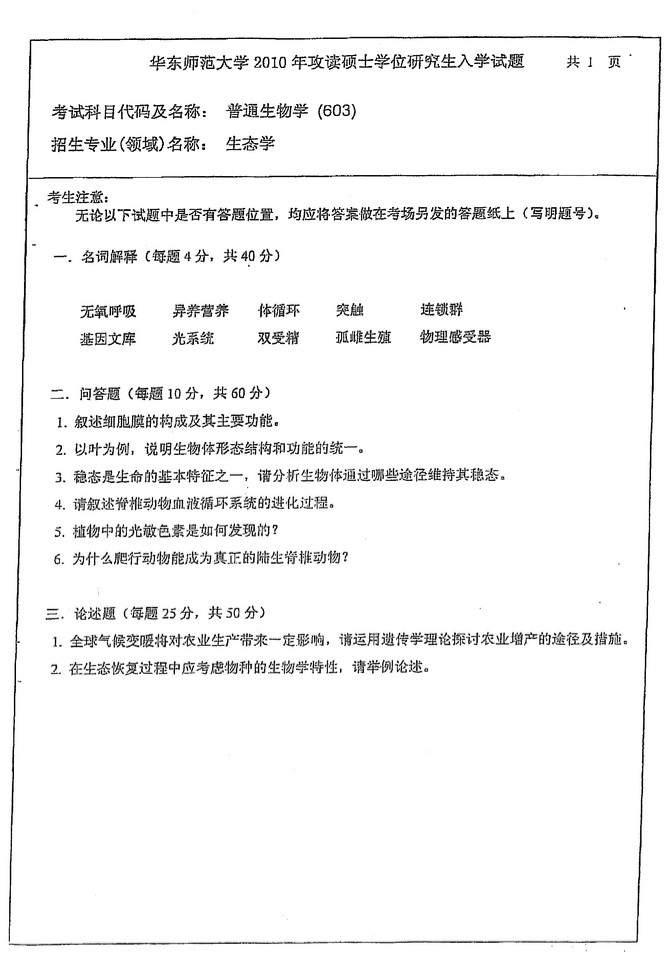 2010-2015华东师范大学713普通生物学A历年考研真题