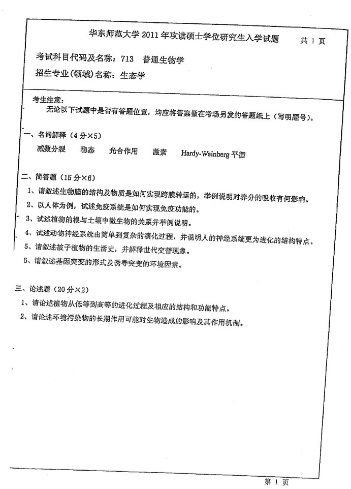 2010-2015华东师范大学713普通生物学A历年考研真题(2)