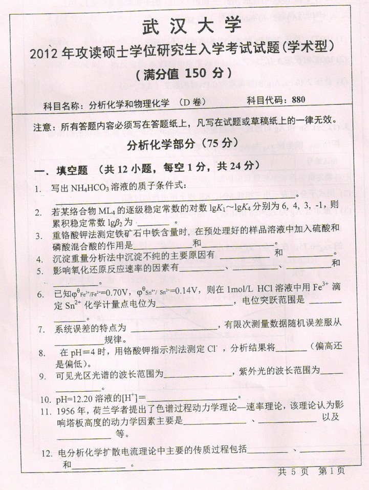 武汉大学2012年无机化学和物理化学D卷880考研真题