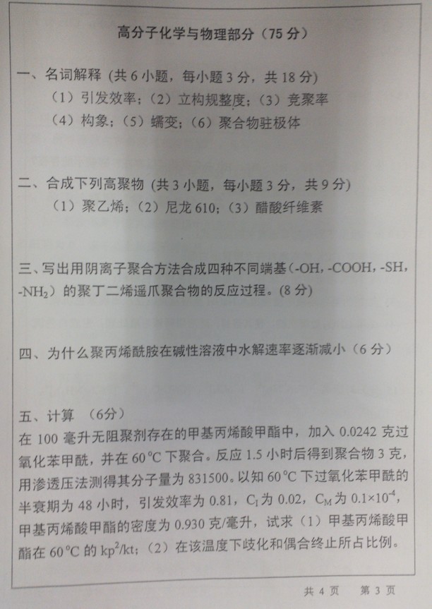 武汉大学2012年无机化学和高分子化学与物理C卷651考研真题(3)