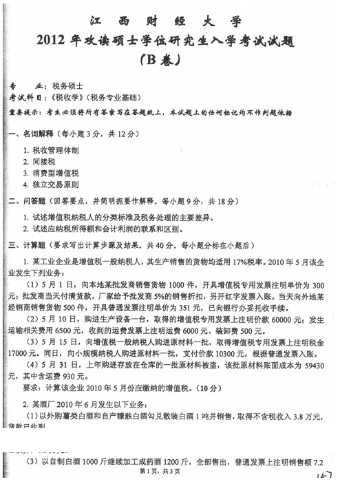 名词解释(4分一个,共5个) 滑准税 虚开发票 税务行政处罚 税负转嫁 抵免法 简答题(9分一个,共5个) 企业所得税中不征税与免税收入内容 企业所得税种不计提折旧情况 增值税视同销售情况 居民个人与非居民个人 税收保全措施的条件和内容等 计算题(10分 10 15 15共4题) 1.增值税计算,最后一小问涉及消费税 ...