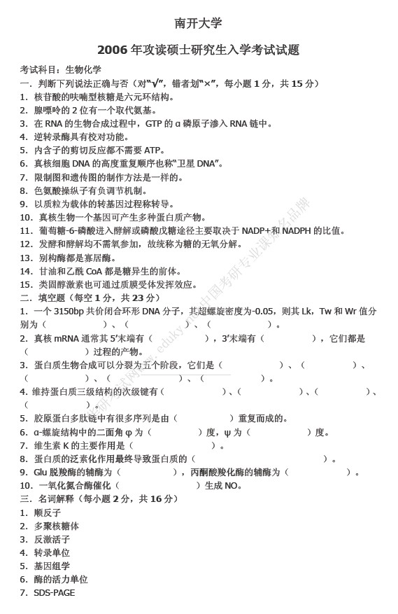 南开大学2011-2010,2006-2004生物化学711考研真题(8)