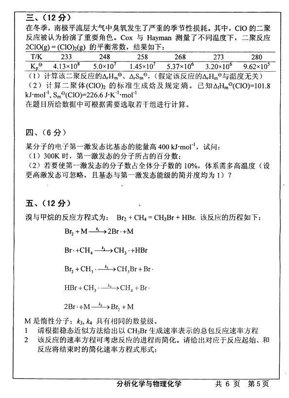 武汉大学2011-2010分析化学与物理化学882考研真题(5)