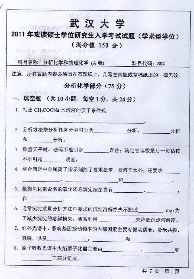 武汉大学2011-2010分析化学与物理化学882考研真题(7)