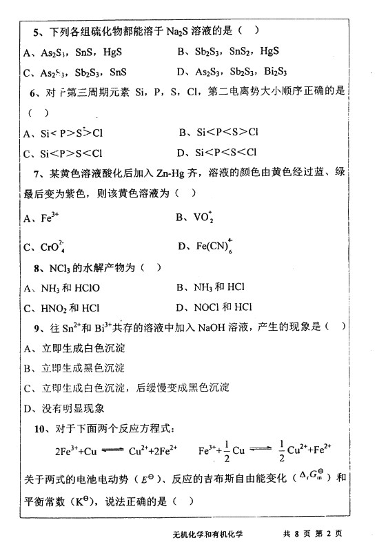 武汉大学2011-2010无机化学和有机化学636考研真题(2)