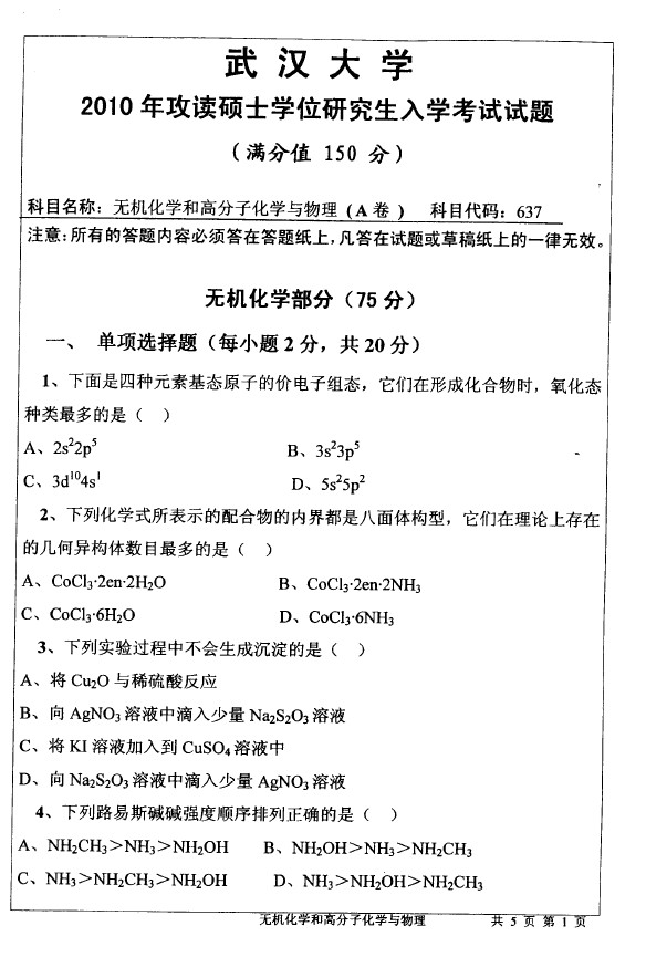 专业课考研资料 本站小编 免费考研网 2020-02-29武汉大学2012年无机化学和高分子化学与物理C卷651考研真题