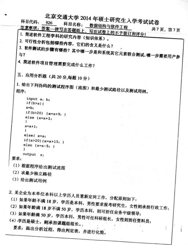 2014年北京交通大学数据结构与软件工程926考研真题(7)