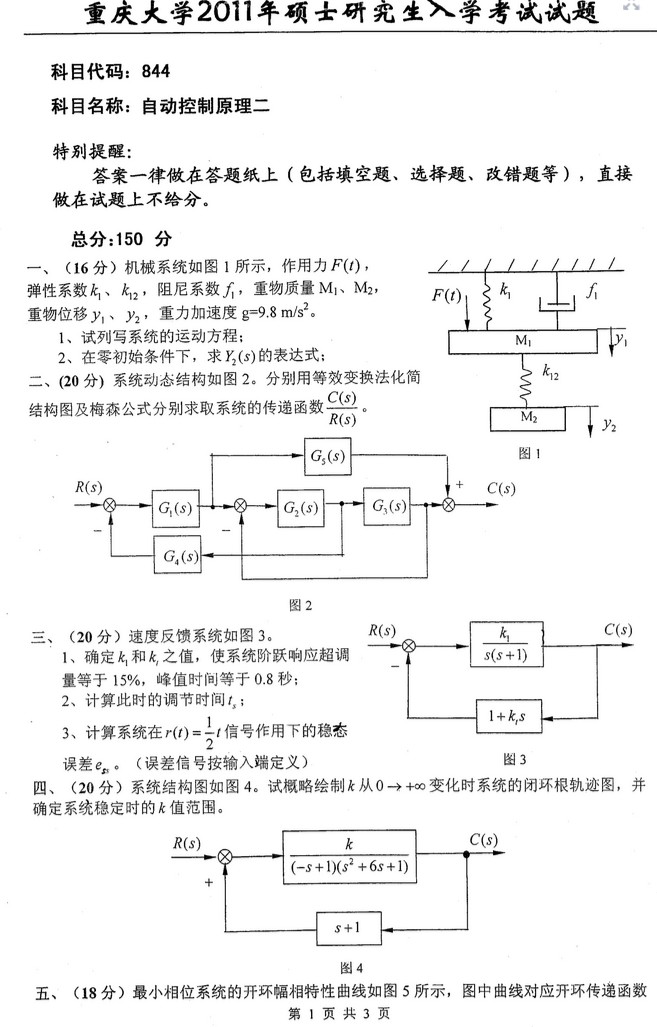2011年重庆大学844自动控制原理二(自动化学院)考研试题