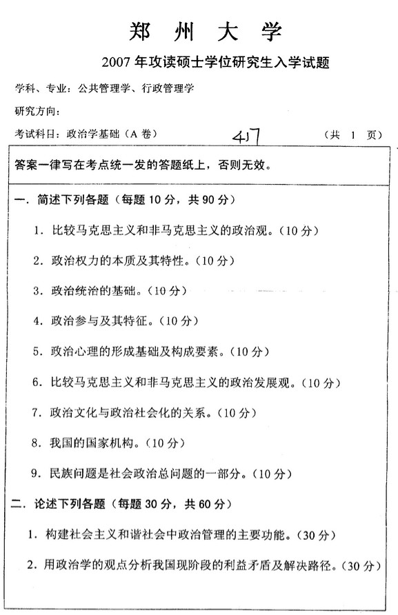 郑州大学2009年研究生入学考试试题考试科目:政治学基础