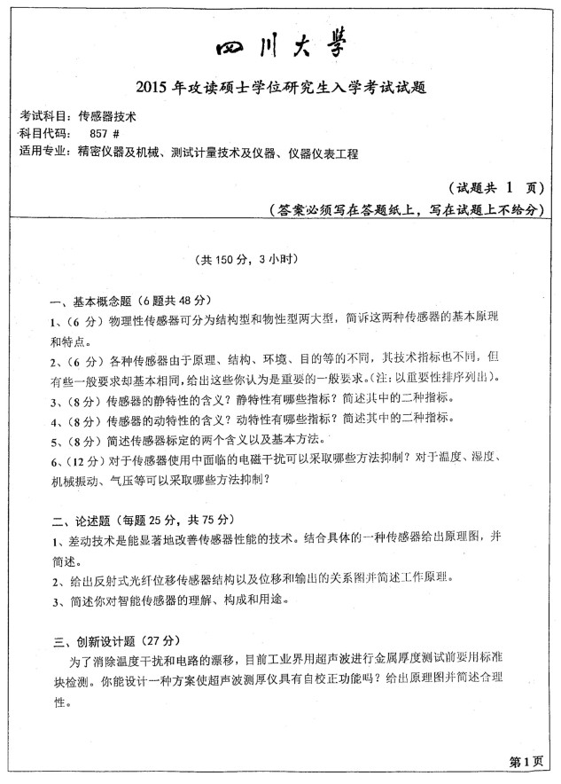 2010年-2011年2014年-2016年四川大学857传感器技术考研真题试题试卷(4)