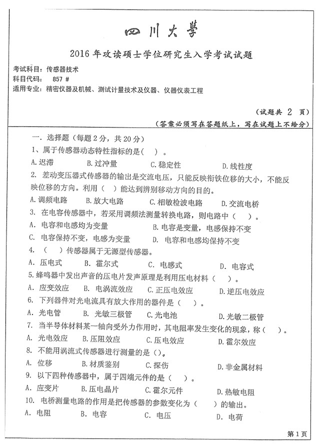 2010年-2011年2014年-2016年四川大学857传感器技术考研真题试题试卷(5)