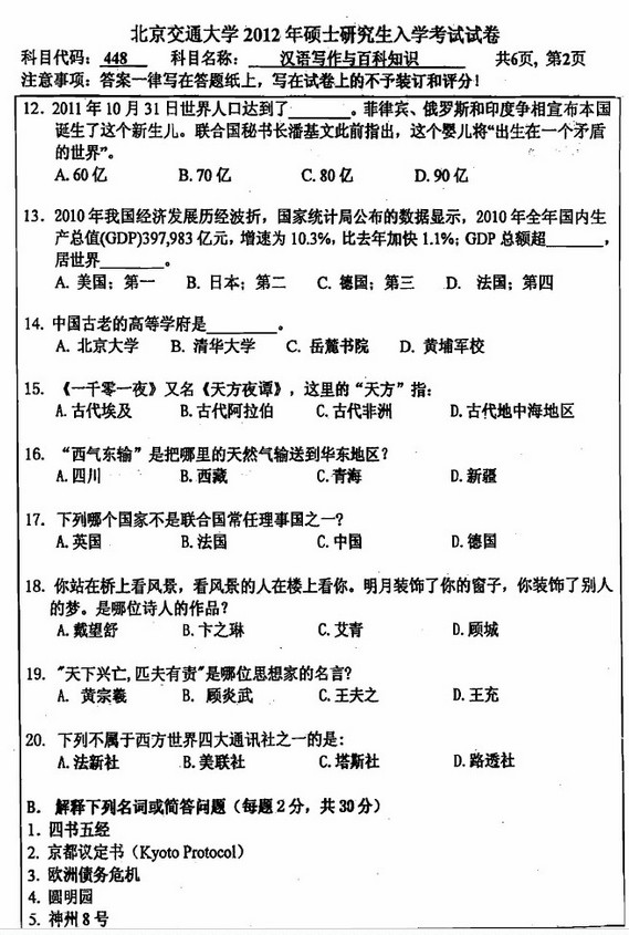 北京交通大学2012翻译硕士MTI汉语写作与百科知识研真题(4)
