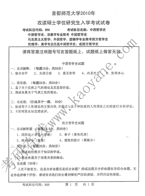 2007-2013首都师范大学中西哲学史历年考研真题(4)