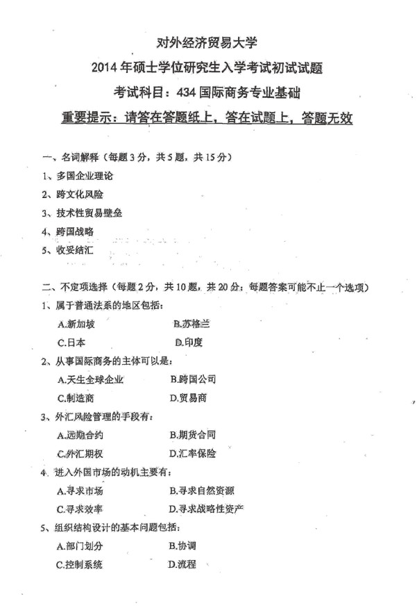 2014年对外经济贸易大学考研国际商务专业基础考研真题