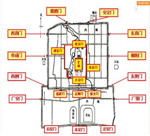 外城、内城、皇城、宫城;城门“内九外七皇城四”;
