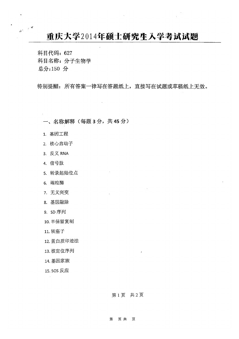 2003-2014重庆大学分子生物学历年考研真题(19)