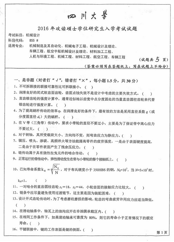 2016年四川大学855机械设计考研真题