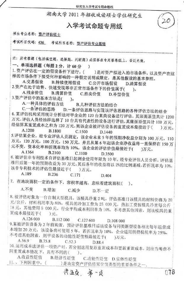 2016 经济学院 资产评估基础试题回忆 1、名词解释:需求、帕累托最优化状态、外部经济与外部不经济(还有几个记不清了) 2、简答题:建筑物评估的特点、股利分配和股票回购的异同、生产者均衡的条件(依然有几个记不清了) 3、判断题:经济学、财务管理、资评的内容全都有,对此只能说要好好看书,好好理解。 4、计算题 ...
