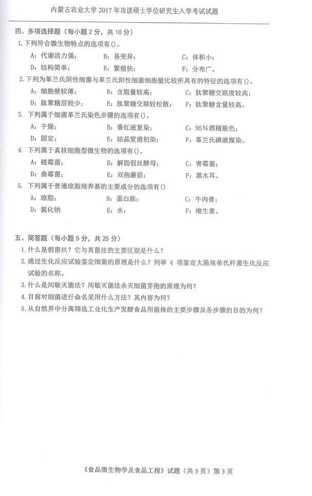 2017年内蒙古农业大学食品微生物学及食品工程原理考研真题(3)